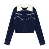 Contrast-Collar Vintage Embroidered Cropped Cardigan