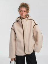 This cozy hooded jacket features stylish contrast trim details and soft fleece fabric, perfect for keeping warm with a trendy edge. Its loose fit provides comfort and a fashionable look for colder days.