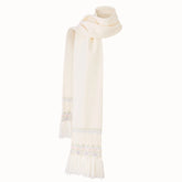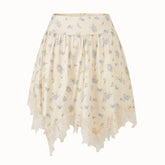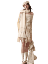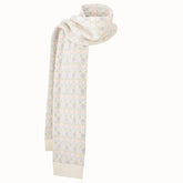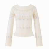 This outfit showcases exquisite craftsmanship through its off-shoulder knitted design, highlighting the elegant neckline and collarbone. The original Fair Isle jacquard pattern combines multiple textured motifs for a delicate, romantic look. The ribbed hemline ensures elasticity and shape retention, while the soft full-body knit offers both warmth and sophistication without bulkiness. The high-waisted floral skirt provides a flattering, cinched silhouette, complemented by its asymmetrical lace-trim hem that adds charm and fluidity to every movement. Featuring a custom floral-printed fabric and hidden YKK zipper, the skirt blends comfort with refined detail. The matching scarf and cuffs are knitted with the same intricate Fair Isle motifs, providing a cohesive and cozy finish to the ensemble.