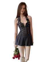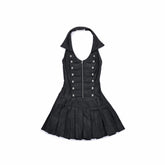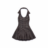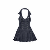 Court-Style Double-Breasted Open-Back Pleated Dress