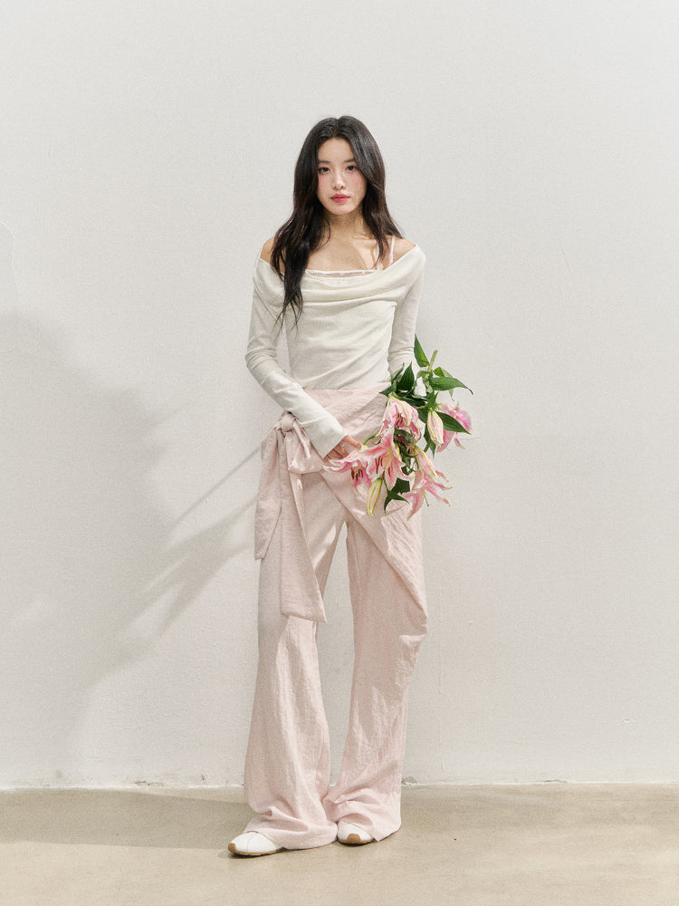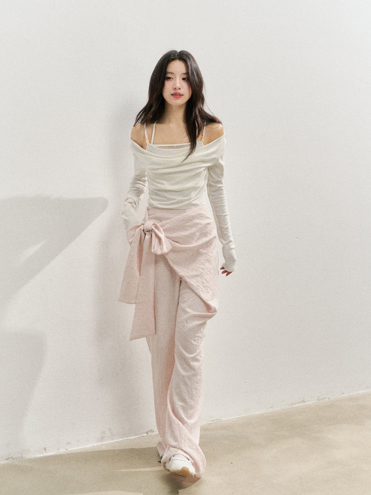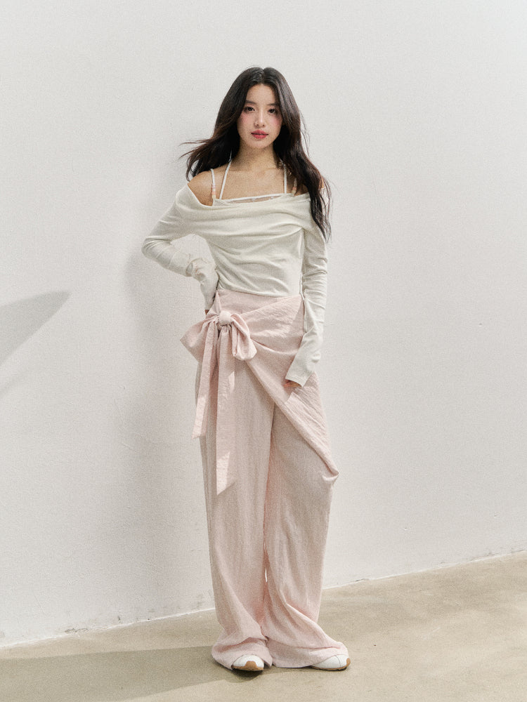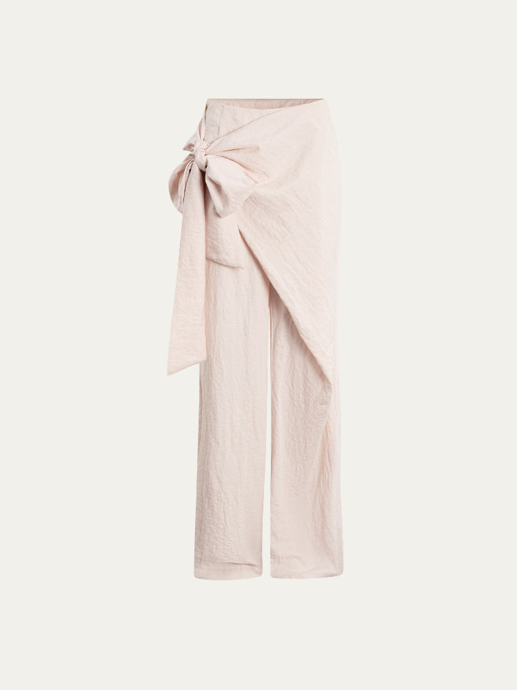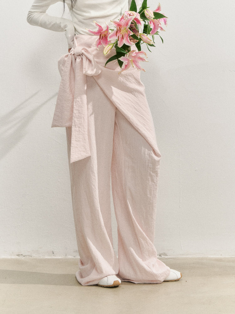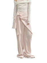 Semi-wrap style pants, with deconstructive design and irregular cutting, adding a three-dimensional sense of hierarchy to the style. Loose and comfortable wide-leg type, taking casualness and fashion to the extreme.The naturally formed patch overlapping design is diagonally wrapped on the front body, and fixed with a side butterfly-shaped ribbon, presenting a unique artistic beauty in the details.No waistband design, the waist design is concise and neat, the waistline fits the body shape, and the style is extremely casual and lazy.One-word pocket design on the back piece, combining practicality and decoration.Invisible zipper on the side seam, smooth teeth, easy to wear.