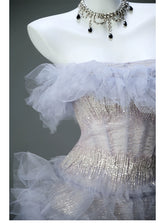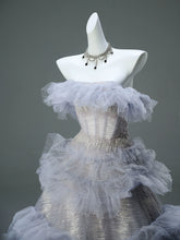 This gown, in a stunning shade of light purple-blue, is a premium, non-market edition featuring seven layers of structured tulle that create a perfect voluminous silhouette.  Designed for customization, the dress supports unique body measurements, including height, weight, and bust/waist/hips, ensuring a tailored fit.  The image showcases the gown without a crinoline, demonstrating its flawless shape and extraordinary design.  This is a high-end, bespoke dress intended for those seeking an exclusive, made-to-order experience.