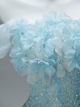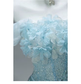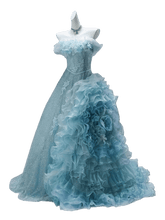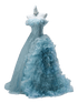 This luminous clear-blue couture gown is constructed with an opulent eight-layer skirt enhanced by an additional outer skirt, creating a flawlessly tiered, voluminous silhouette with fluid architectural depth. The waist is reinforced with twelve precisely positioned boning channels, sculpting a refined, three-dimensional shape that enhances elegance and posture. Rendered in a serene sky-blue hue and crafted through intensive hand-finished techniques, the gown stands as a true heavy-work atelier masterpiece—not a market-version product. It is offered exclusively through full customization based on the client’s height, weight, and full body measurements, ensuring a perfectly contoured, bespoke fit.