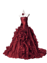 This opulent burgundy couture gown is engineered with fourteen meticulously positioned boning channels, sculpting the waist into a sharply defined, three-dimensional silhouette with exceptional structural precision. Its six-layer skirt, enhanced by an additional tiered outer construction, forms a dramatic and flawlessly voluminous profile, blending rich texture with architectural depth. Crafted through intensive hand-finished techniques, this piece exemplifies true heavy-work atelier craftsmanship—not a market-version product. The gown is available exclusively through full customization based on the client’s height, weight, and complete body measurements, ensuring a perfectly contoured, bespoke fit.