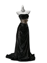 Crafted for the discerning individual, the Eclipse Gown redefines modern opulence through a symphony of texture and detail.  Cut from lustrous silk velvet in deep noir— a hue that embodies timeless sophistication— its figure-hugging mermaid silhouette cascades into a subtle train, balancing drama with refined elegance.