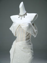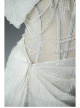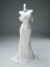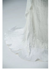 Crafted from imported acetate fabric featuring an intricate bamboo-leaf crinkle technique, this gown presents an elegant off-white tone with a sculptural, ethereal drape. As a luxury handcrafted piece—not a market-version product—it supports only full customization based on the client’s height, weight, and complete body measurements, ensuring a flawlessly tailored couture fit.