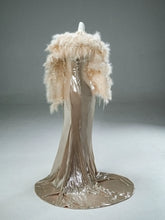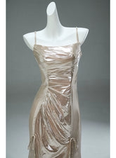This champagne-hued couture gown is crafted with five precision-placed boning structures, delivering refined support and a flawlessly sculpted silhouette. The liquid-satin finish drapes elegantly along the body, enhanced by delicate gathers that create a sophisticated, elongated line. Entirely executed through labor-intensive artisanal techniques, this piece stands far above any market-grade production in both craftsmanship and detail.