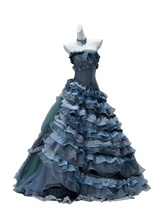 This exquisite blue gown is a handcrafted, one-of-a-kind design not available in the market. The dress features a stunning 4-layer skirt with an additional outer layered design, creating a perfectly structured and voluminous silhouette. The gown is enhanced with beautiful detailing, including delicate lace embellishments and floral accents. It also includes 10 pieces of bone structure at the waist, providing firm support and a sculpted shape. The picture showcases the flawless fit of the gown without a crinoline, further enhancing the dress's luxurious design. This dress is custom-made based on the height, weight, and measurements of the wearer, ensuring a personalized and perfect fit.