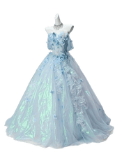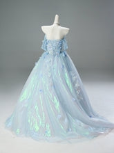 Inspired by the dreamy glow of a “Silent Jellyfish,” this iridescent pale-blue couture gown floats around the body like mist over the sea.  An 8-layer full skirt creates a perfectly sculpted ball-gown silhouette, catching the light with every step for a luminous, underwater shimmer.  The bodice is reinforced with 8 internal boning channels at the waist, providing firm support and a refined, three-dimensional shape that cinches the waist and elongates the figure.