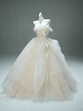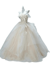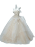 This ethereal off-white couture gown is sculpted with a grand seven-layer skirt, forming a flawlessly balanced, voluminous silhouette with airy elegance. Thirteen meticulously placed boning channels structure the waist, creating refined three-dimensional shaping and a beautifully contoured form. Distinguished by intensive handcrafted detailing, this piece represents true atelier craftsmanship—not a market-version product. The gown is available exclusively through full customization based on the client’s height, weight, and complete body measurements, ensuring an impeccably tailored bespoke fit.