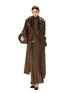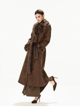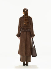 A refined autumn/winter statement coat featuring a retro-inspired silhouette. Designed with a classic notched lapel, double-breasted front, and a detachable waist belt to define the figure. The longline cut offers elegant coverage, while the faux fur suede texture delivers a luxurious, warm, and structured look suitable for everyday wear or elevated occasions.