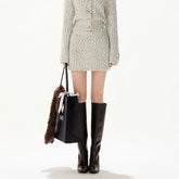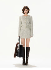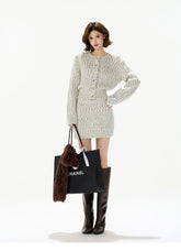 This CYNR original design two-piece knit set features a plush, handcrafted texture inspired by classic French “chic tweed” aesthetics. Made with long-pile chunky knitting, the cardigan offers a soft, voluminous feel while maintaining a refined silhouette through its waist-defining cut. The matching mini skirt is designed with a stretchy waistband for comfort and a clean, structured shape. Elegant yet cozy, this coordinated set delivers a polished look with a touch of effortless femininity, ideal for autumn and winter styling whether worn together or styled separately.