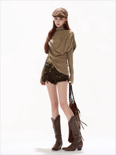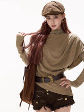 This original designer knit top delivers an effortless, relaxed aesthetic with sculptural draping and modern texture. Designed with a softly ruched high collar and batwing sleeves, it creates a fluid, irregular silhouette that feels cozy yet elevated. The loose fit allows natural movement and layering ease, while the asymmetric hem and refined knit texture add depth and character. Perfect for autumn and winter styling, this pullover works as a statement top or a versatile layering piece with a laid-back, artistic mood.