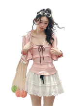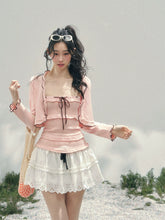 A soft French-inspired two-piece set featuring a delicate knit camisole and a cropped cardigan. The design blends sweetness with elegance, creating a layered spring look that feels light, romantic, and feminine.