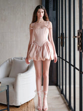 This V-shaped waist-boning design with a short flower bubble skirt enhances the waistline while increasing proportion. The soft strap design allows for adjustable lengths, offering various styling options.