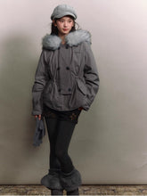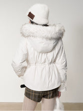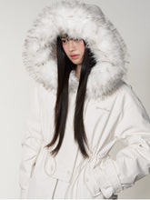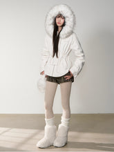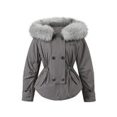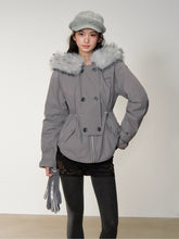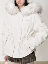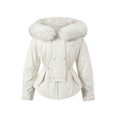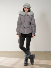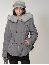 A contemporary short parka jacket designed with a cinched waist and adjustable drawstring for a flattering, feminine silhouette. The detachable oversized faux fur collar, made from high-pile dyed faux sheepskin, adds warmth and a rich layered texture. The double-breasted placket blends vintage elegance with practical style, while elasticated cuffs and hem offer both visual balance and wind protection. Crafted from high-density, water-resistant polyester for lightweight comfort and insulation balance. Filled with premium 90-certified white duck down, it ensures a soft, puffy texture and reliable warmth. Available in gentle cloud white or misty gray tones, this piece exudes effortless sophistication and versatile winter charm.