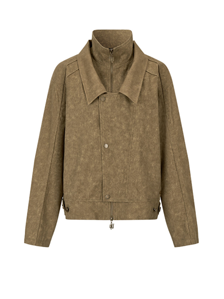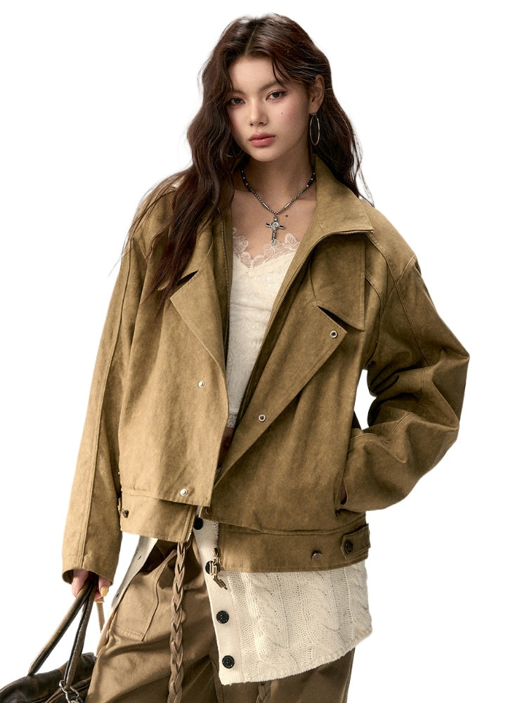 Merging a vintage rustic style with a two-piece layered look, this jacket brings a retro-modern charm.