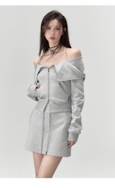 Gray & Brown Hooded Off-Shoulder Blouse & Shorts Set - CHINASQUAD