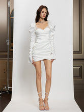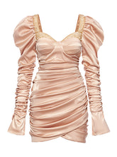 This elegant satin dress features ruched details and beaded embellishments along with leg-of-mutton sleeves. Made of a comfortable polyester-spandex blend, it provides a fitted, body-hugging look. Available in sizes XS to L, the dress is designed to flatter various body shapes.