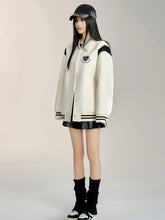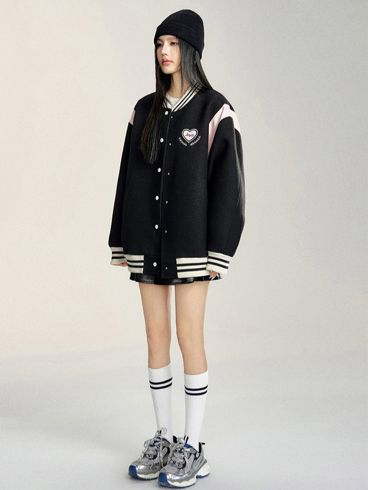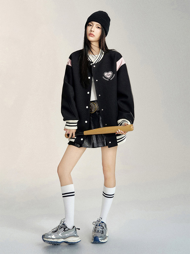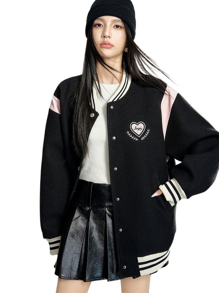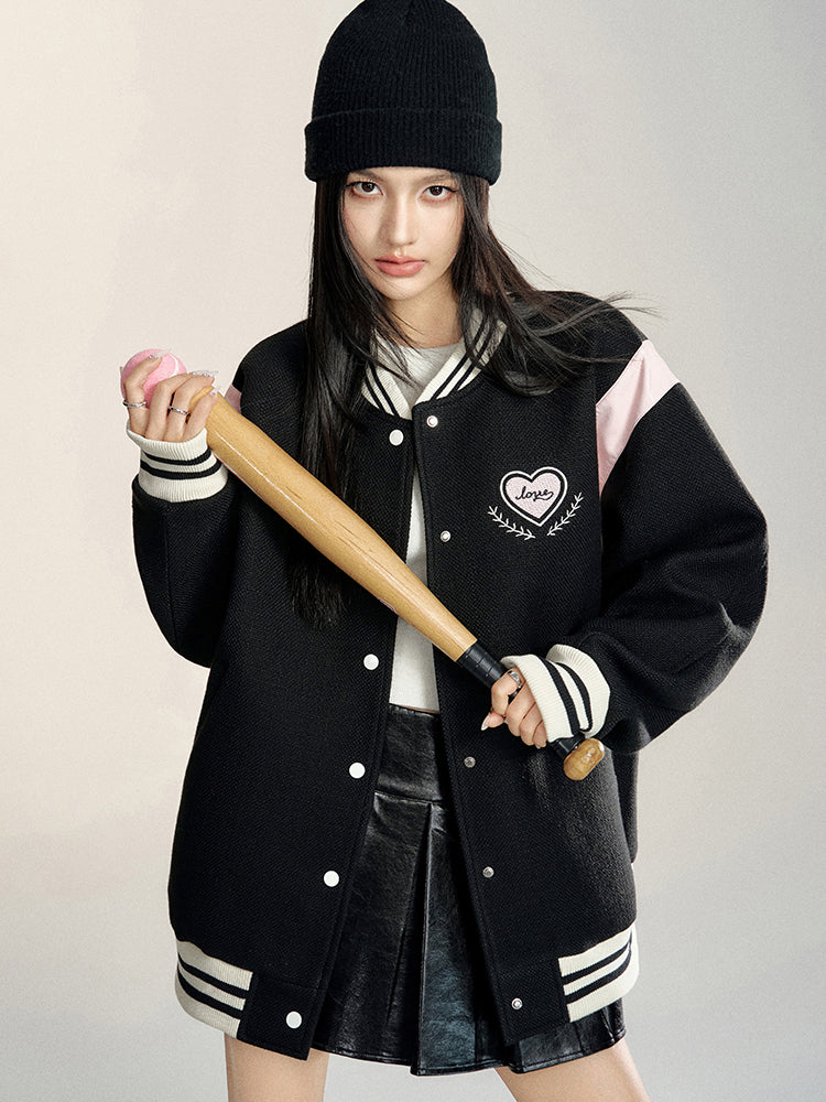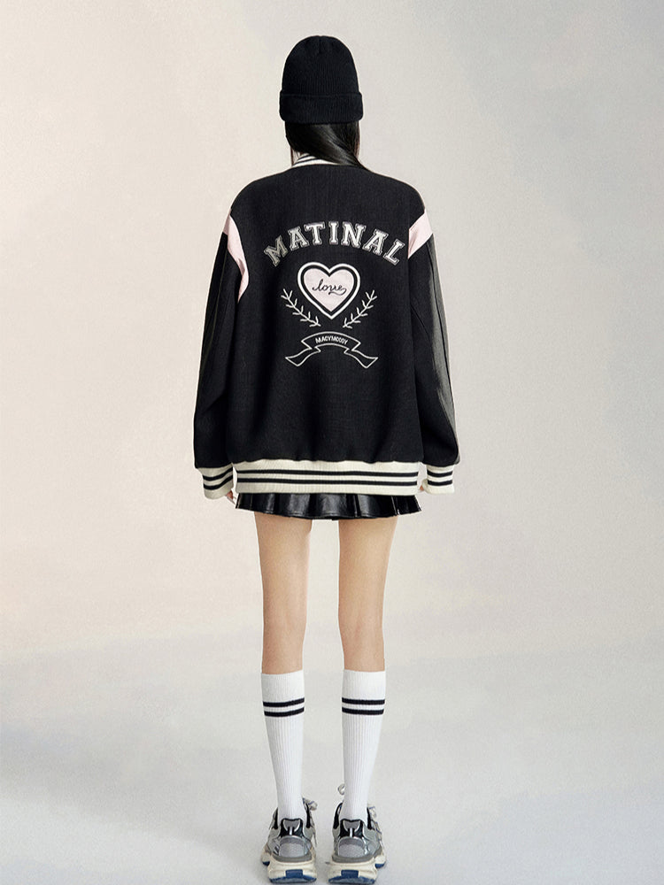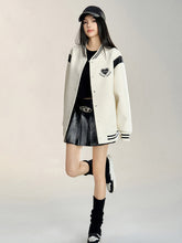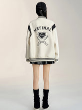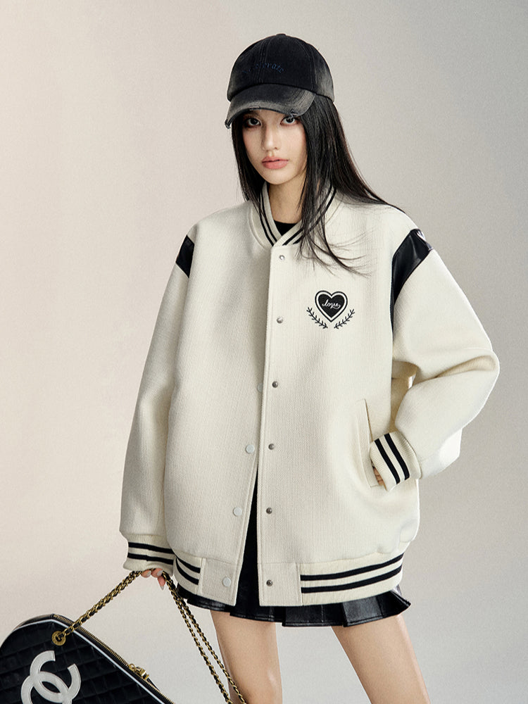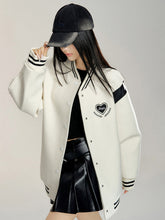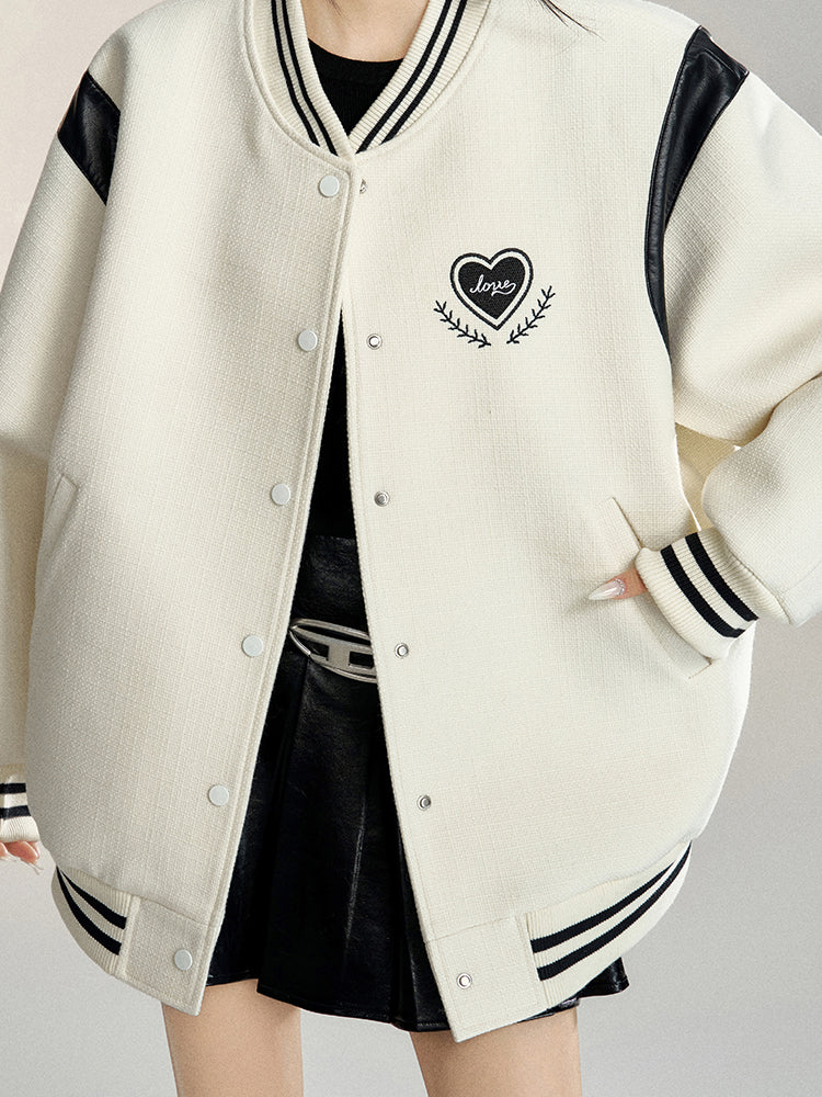 (Final Sale) White & Black Heart Embroidered Baseball Jacket