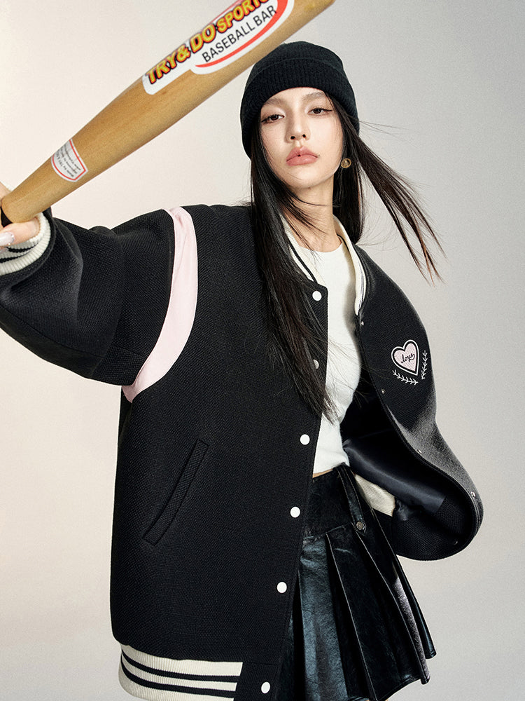 This baseball jacket features a retro-inspired contrast rib-knit collar design with stitched trim at the neck. The tailored cut with contrasting leather patches adds an eye-catching detail, while fine embroidery highlights the sweet and cool elements of the jacket. The athletic rib-knit cuffs provide a casual and trendy vibe.