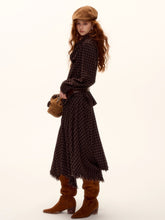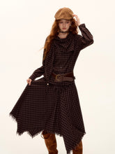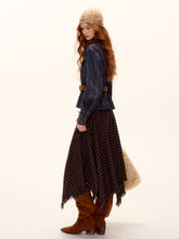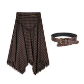 This statement skirt channels a refined yet edgy aesthetic, featuring a deconstructed asymmetric silhouette with a raw frayed hem. The plaid pattern combines classic texture with a modern industrial edge, while the studded belt accentuates the waistline for a flattering A-line shape. Its flowy drape and irregular cut create dynamic movement, perfect for styling with structured tops or leather outerwear in a contemporary “Maillard” tonal palette.