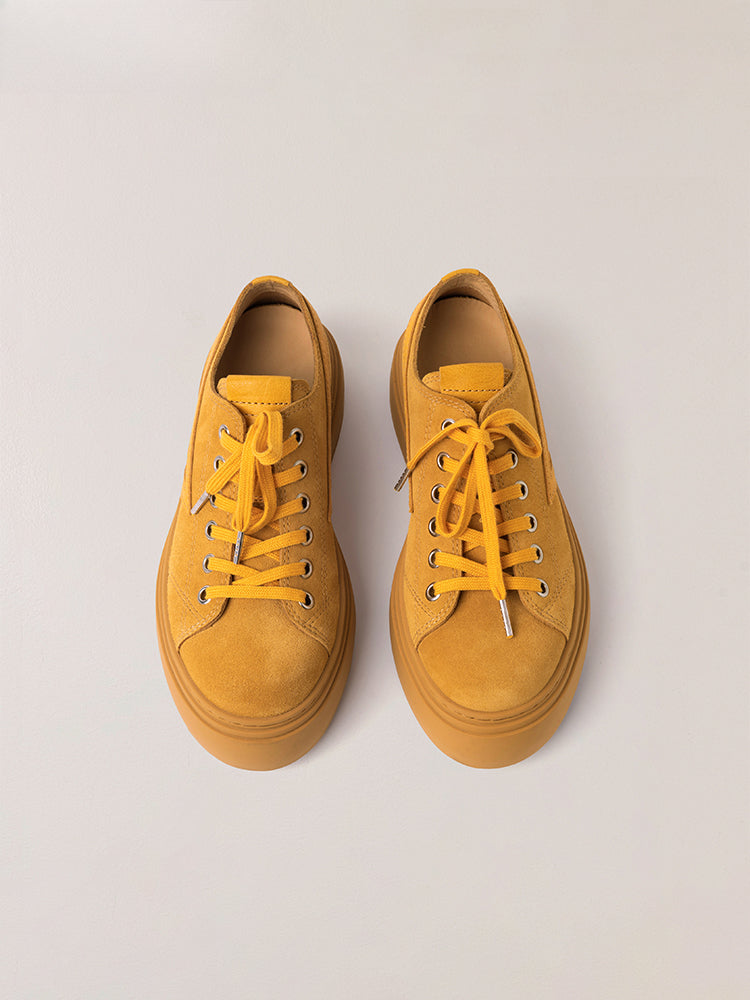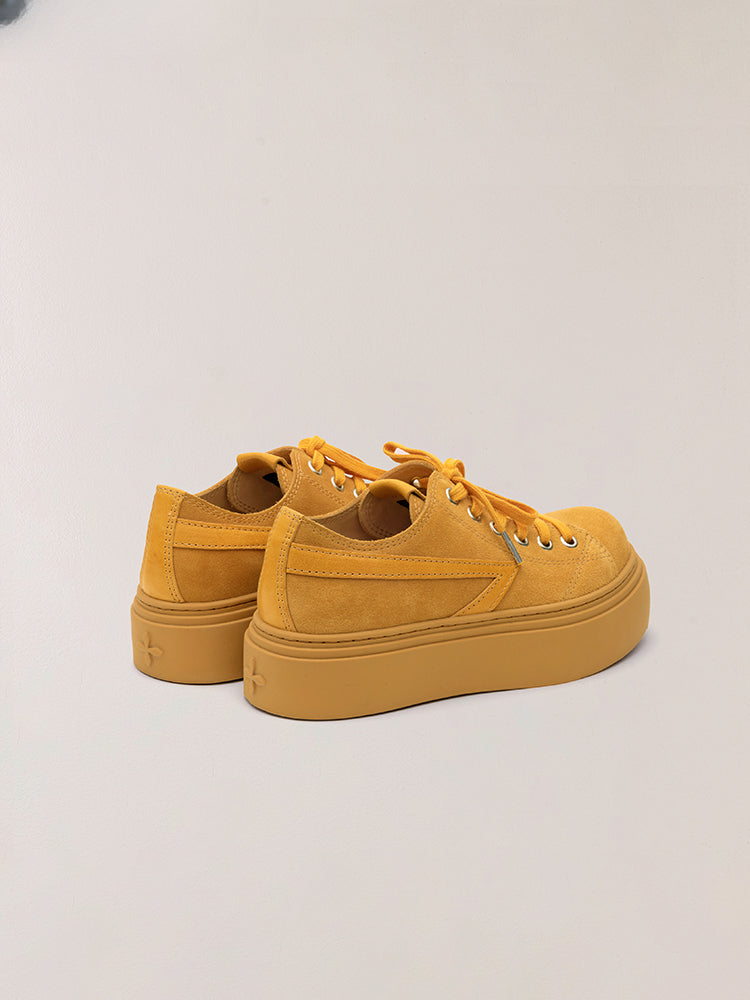The entire exterior uses fine suede cowhide, and the inner lining uses SMFK's classic water-dyed variegated cowhide, bringing users a comfortable skin touch and breathable function. With the edge cutting method, you can simply and directly feel the edges and thickness of the external leather and the inner lining. The yellow full grain cowhide material is arranged on the trapezoidal tongue and the decorative edge strips on the outside of the shoe body. The design inspiration comes from the side lines of a sports car body and the sports car seats.