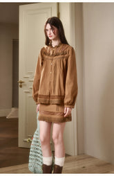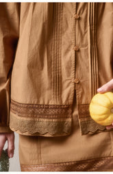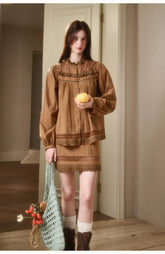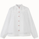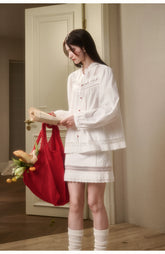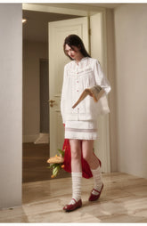 This ensemble features a delicately designed blouse and high-waist skirt set that blends vintage charm with refined craftsmanship. The rounded collar trimmed with layered lace ruffles exudes femininity, while the soft cotton fabric provides a gentle, elegant drape. Contrasting red buttons add a touch of playful sophistication, enhancing the visual layering of the piece.