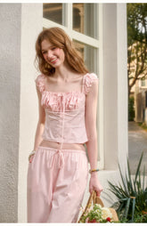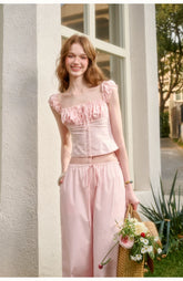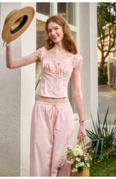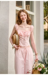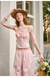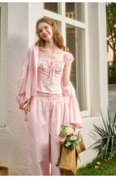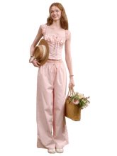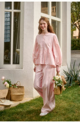 Rendered in a soft baby pink tone, this two-piece set embodies romantic elegance with a refined “old money” aesthetic. Crafted from 100% natural cotton, the fabric offers breathable comfort with a gentle, structured drape. The cropped top features a clean silhouette with a softly defined waist, creating a flattering and feminine proportion. Paired with relaxed straight-leg trousers designed with an elasticated waistband, the set balances effortless comfort with understated sophistication. Perfect for elevated everyday wear or polished leisure styling.