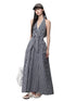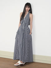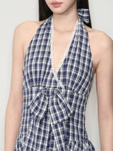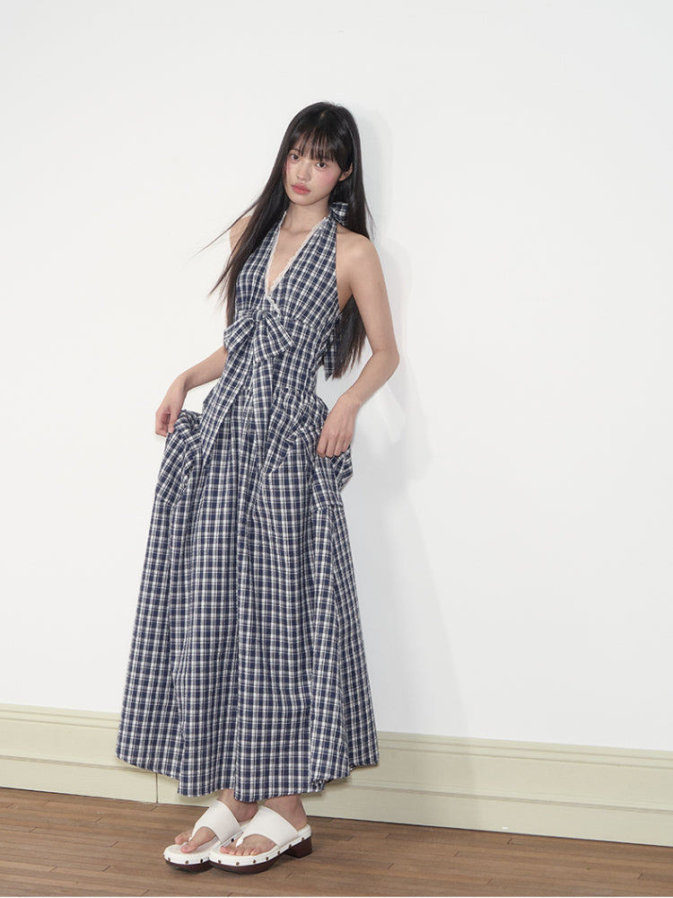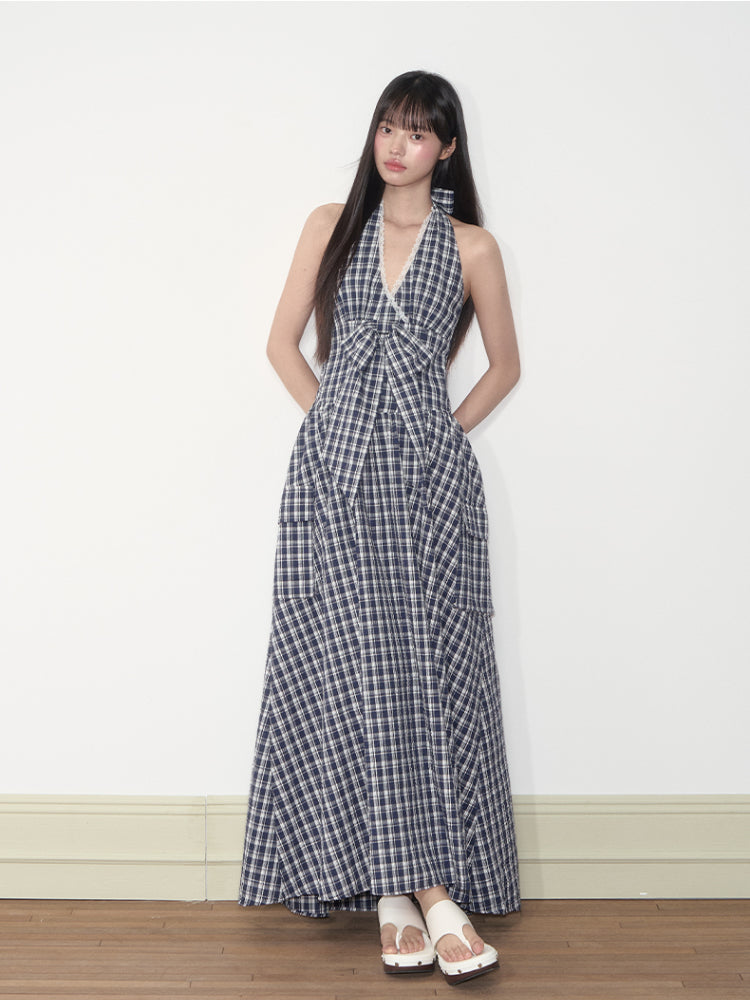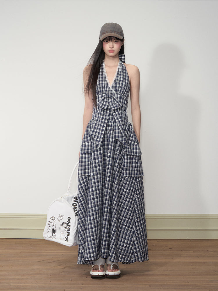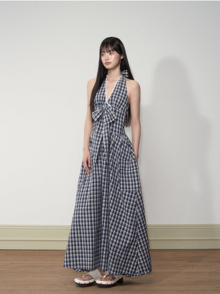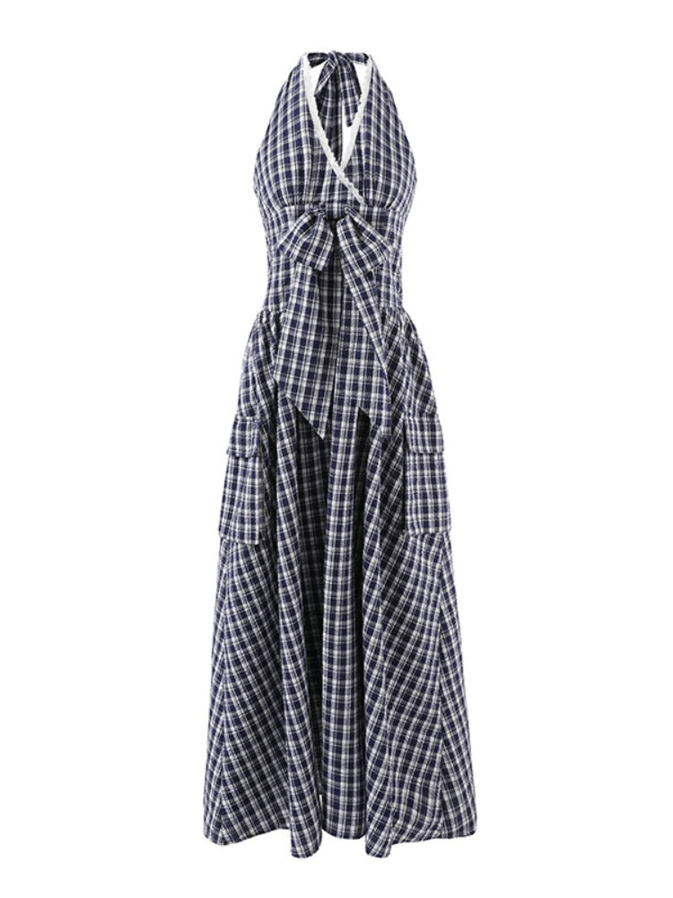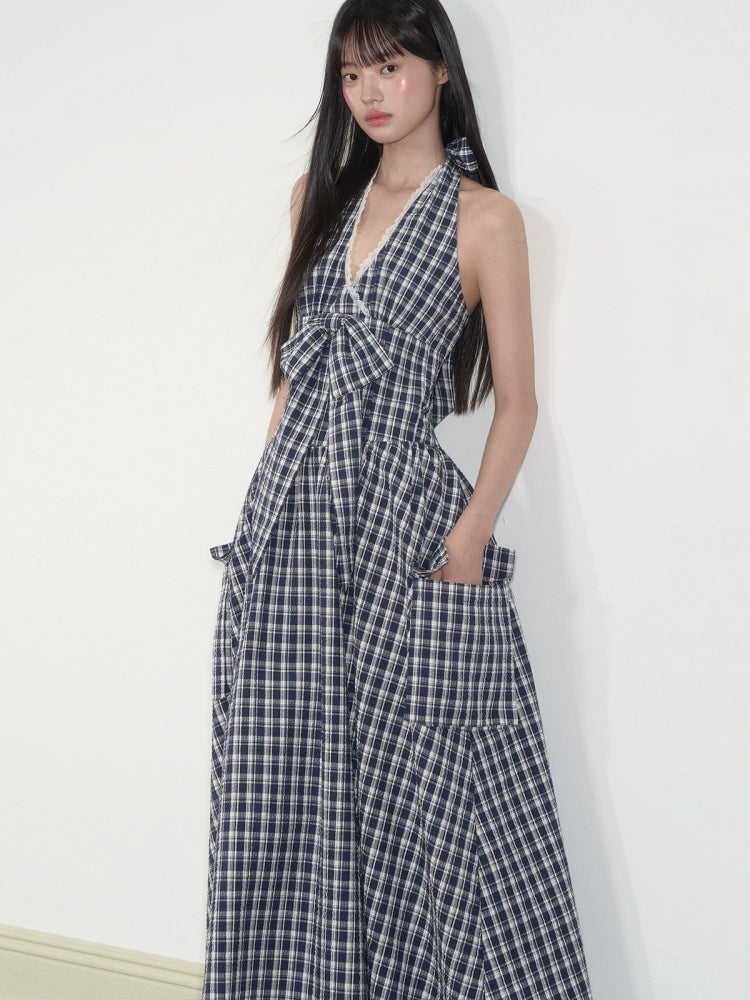 The halter tie is paired with delicate lace edging, exuding a touch of elegance in a casual style. The bowknot decoration on the chest gives it a cute and playful look, full of vacation vibes. The overall fabric is bubble embossed cloth, with a surface showing a concave - convex texture, which is relaxed and natural. It feels soft, has a cotton - like feel, and is comfortable and breathable. The side patch pockets break the traditional long - dress pocket design, adding a bit of a neutral touch to the long dress. The overall large A - line silhouette has ample flare, being灵动飘逸 and casually lazy. The dark blue checkered color - blocking is versatile and never goes out of style. The bright color combination and appropriate skin exposure.