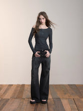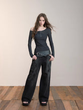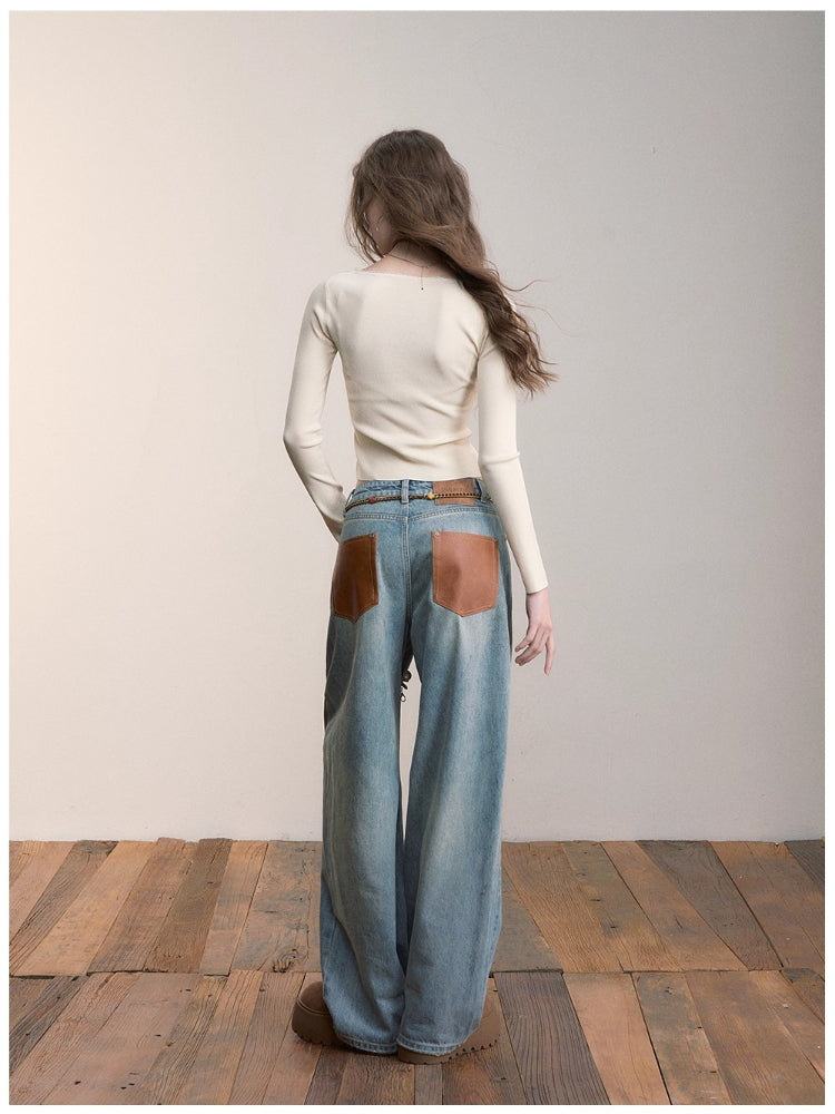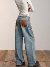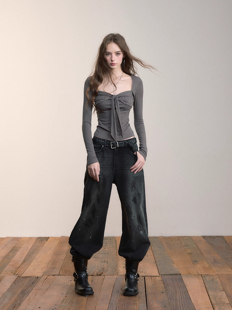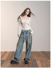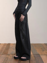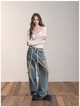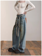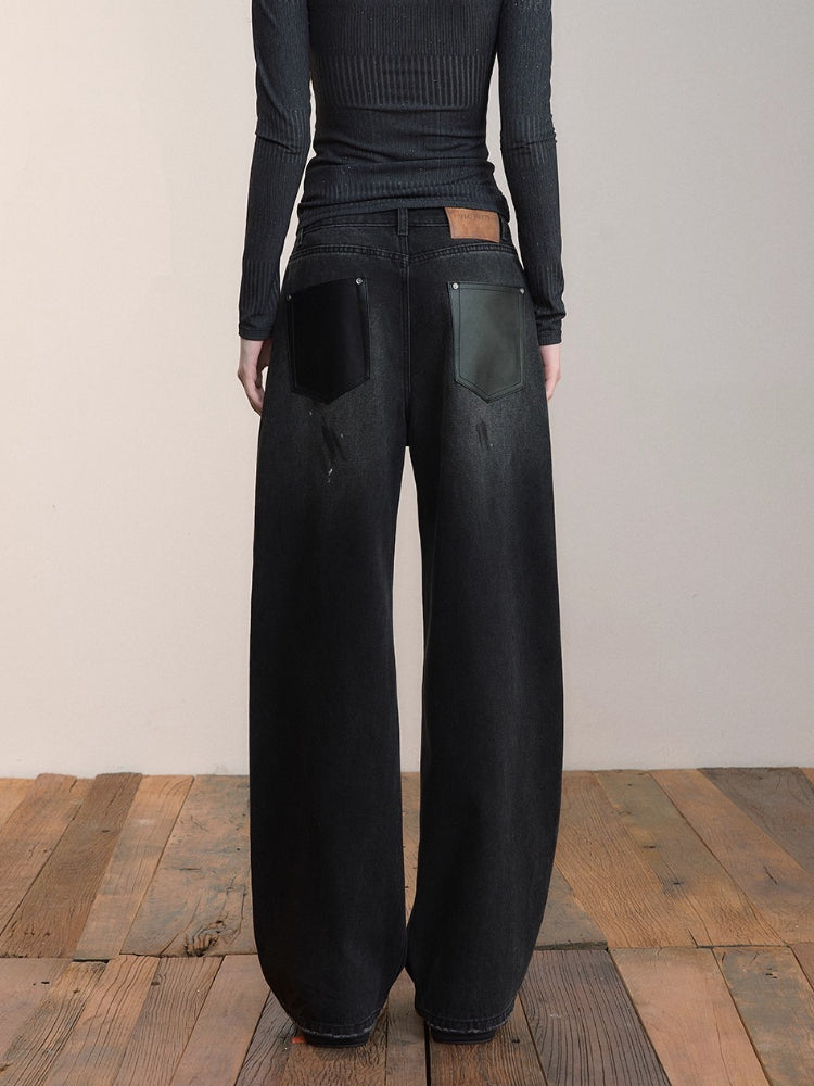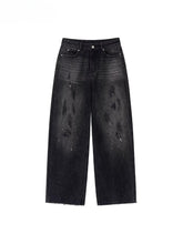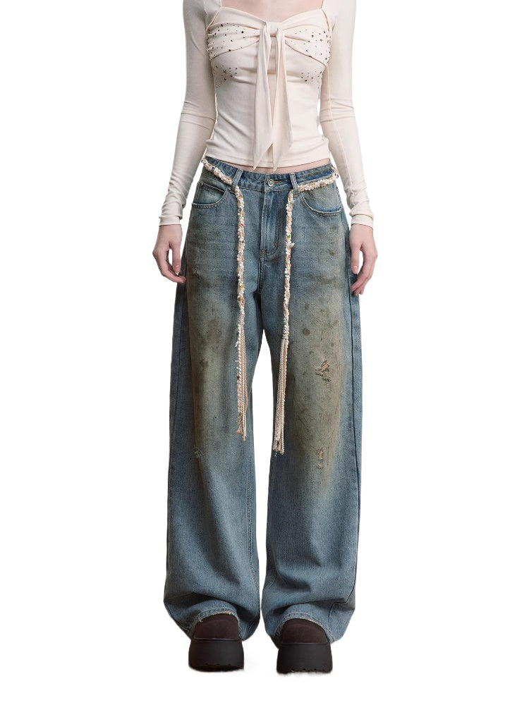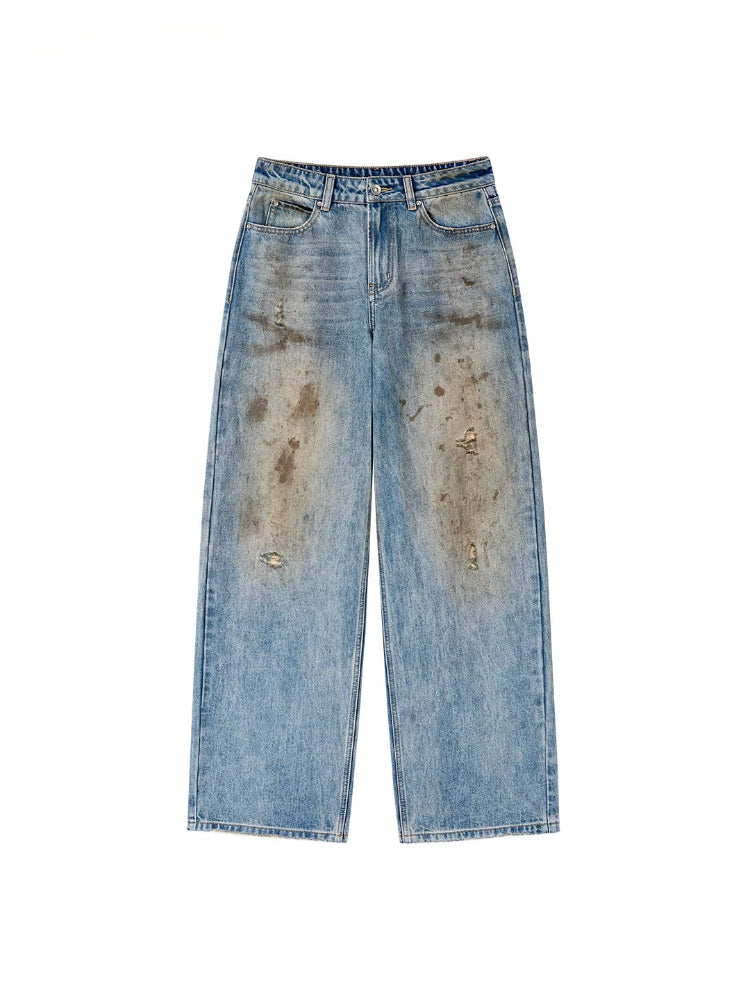 Heavy-duty distressed wide-leg jeans bring out the street rebellious vibe. The surface shows varying shades and distressed textures.