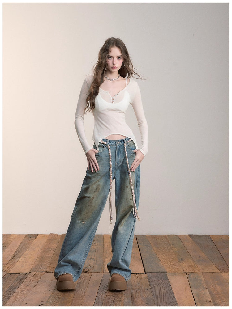 Heavy-Duty Distressed Wide-Leg Jeans - CHINASQUAD