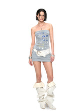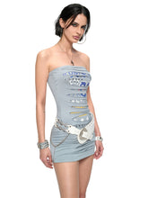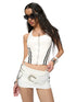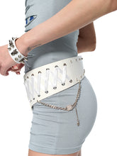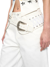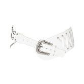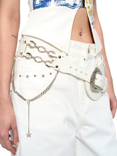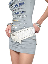 A modern, sculptural belt crafted in an irregular silhouette, featuring a mix of rhinestone studs, embroidered logo detailing, metal chains, ribbon elements, and grommet accents. Designed in a crisp white fish-scale–pattern PU, it blends futuristic edge with feminine detailing, making it a standout accessory for styling dresses, denim, or statement streetwear looks.