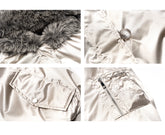 This oversized hooded winter jacket is designed with a relaxed, cocoon-like silhouette that delivers both warmth and a modern street-style attitude. The champagne-toned glossy fabric offers a subtle sheen, giving the piece a refined retro texture. Custom ribbing provides a snug, resilient stretch for enhanced comfort. The hood is trimmed with a custom tri-color faux bunny-fur collar, adding volume and a soft touch. The interior is lined with plush faux mink for cozy insulation. Functional elements include double flap pockets at the front and a single side-zip sleeve pocket, making the jacket practical while maintaining its elevated aesthetic.