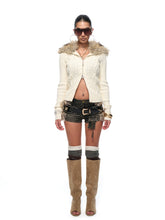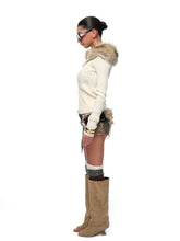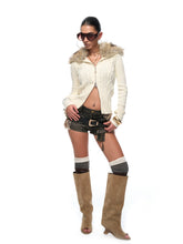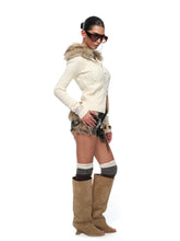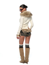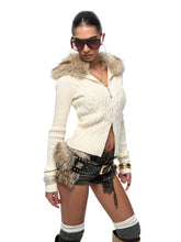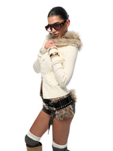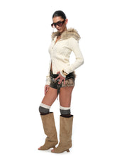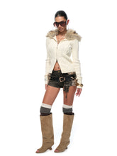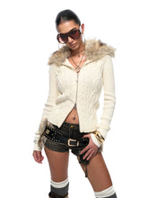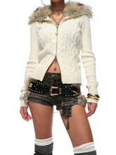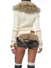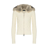 This fitted turn-down collar cardigan is crafted from a 24-count wool-blend yarn that delivers a soft, skin-friendly touch with excellent warmth retention. The body features a double-seed knit texture, while the sleeves use a chunky ribbed structure for added dimension. The collar is paired with a custom tri-color faux-fur trim for a playful Y2K attitude. A double-ended zipper at the front is enhanced with custom rhinestone zipper pulls, allowing versatile styling options—whether worn open, closed, or partially unzipped for shaping.