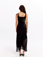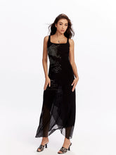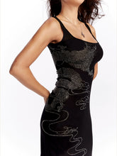 A striking long mesh dress crafted with a double-layered tulle design, featuring original dragon-scale rhinestone embellishment for a bold, sculptural shimmer. The sleek black silhouette hugs the body while offering comfortable stretch, creating an elegant yet sensual look ideal for spring and summer styling.