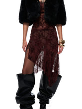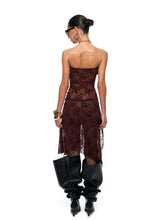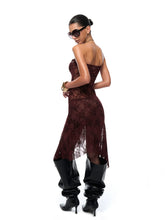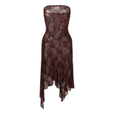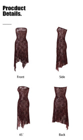 This fitted high-slit mini dress features an asymmetrical hemline and a flattering push-up bodice silhouette. Crafted from semi-sheer burnout velvet with multitone red floral patterns, the fabric presents a festive, romantic atmosphere ideal for Christmas and New Year occasions. The bust is lined with black anti-slip tape for secure wear, while a hidden side zipper ensures easy dressing. A sparkling rhinestone logo embellishment decorates one side of the chest, adding a refined touch to the festive design.