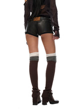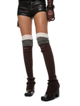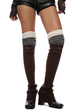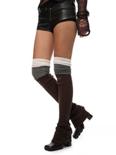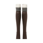 A retro-inspired pair of over-knee socks featuring a gray-white contrast base with brown colorblock detailing. Designed with a front split at the leg opening, highlighted by a four-button hand-stitched decoration that allows subtle adjustability. Custom brand embroidery is placed at the knee, while the firm rib-knit construction and high elasticity create a slimming leg effect. The stacked “scrunch” silhouette adds a nostalgic Y2K touch.