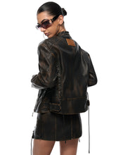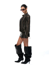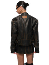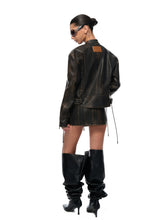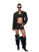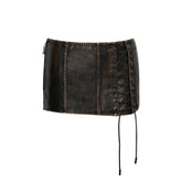 A retro-inspired two-piece biker set crafted from durable PU leather with a heavy-washed finish, presenting an uneven charcoal-black hue for a distressed, vintage effect. The top features a loose trapeze silhouette with dual side grommet-drawstring details that gently cinch the waist. The matching low-rise mini skirt includes a built-in lining to prevent shine-through, a side zipper for convenience, custom rhinestone embellishments, and an additional grommet-drawstring accent on the left side. Rugged yet refined, the set delivers a bold moto aesthetic with contemporary streetwear appeal.