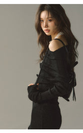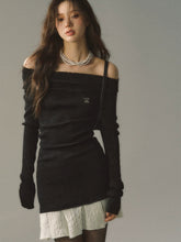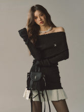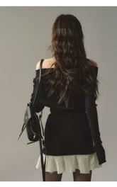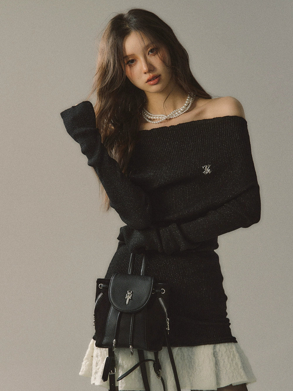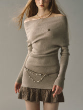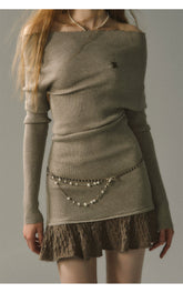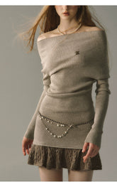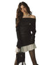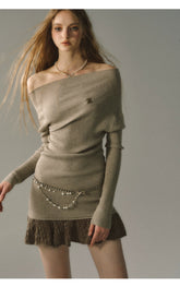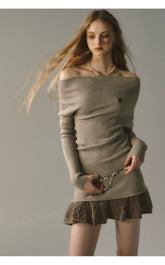 This chic knit dress by VIAPITTI features an off-shoulder design with a fitted bodice and flared hem, making it perfect for spring fashion. The contrasting skirt detail adds a playful yet elegant touch. Ideal for a modern and stylish look with a touch of edginess.