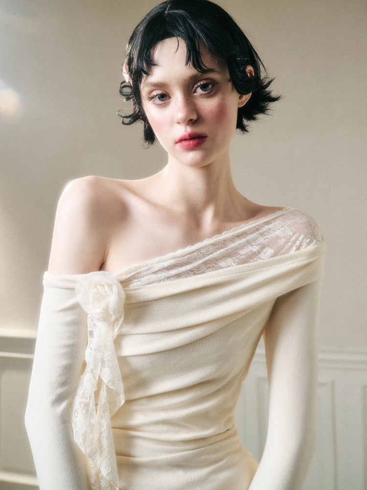 This top features lace floral details with an asymmetrical off-shoulder design, giving it a feminine and stylish look. The soft fabric is comfortable and stretchy, with the added versatility of being worn both casually and for special occasions.