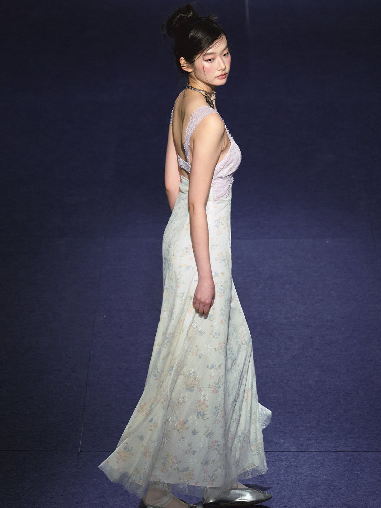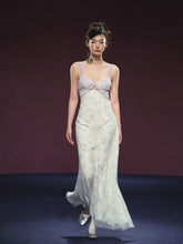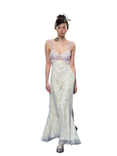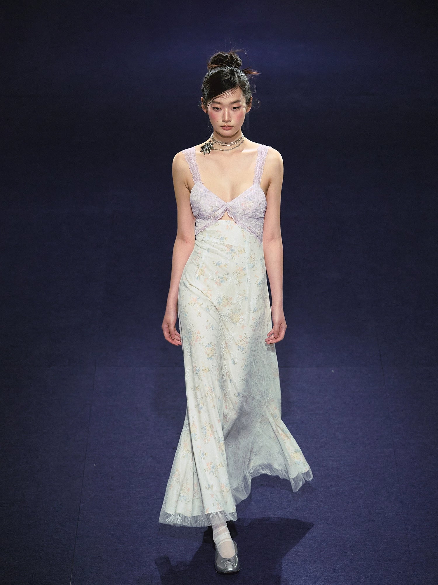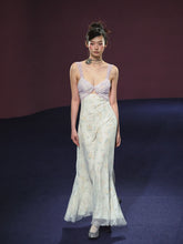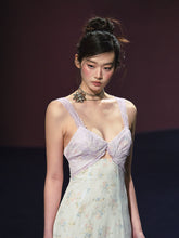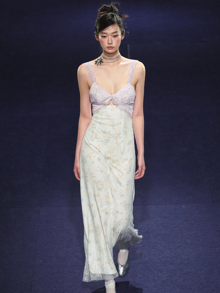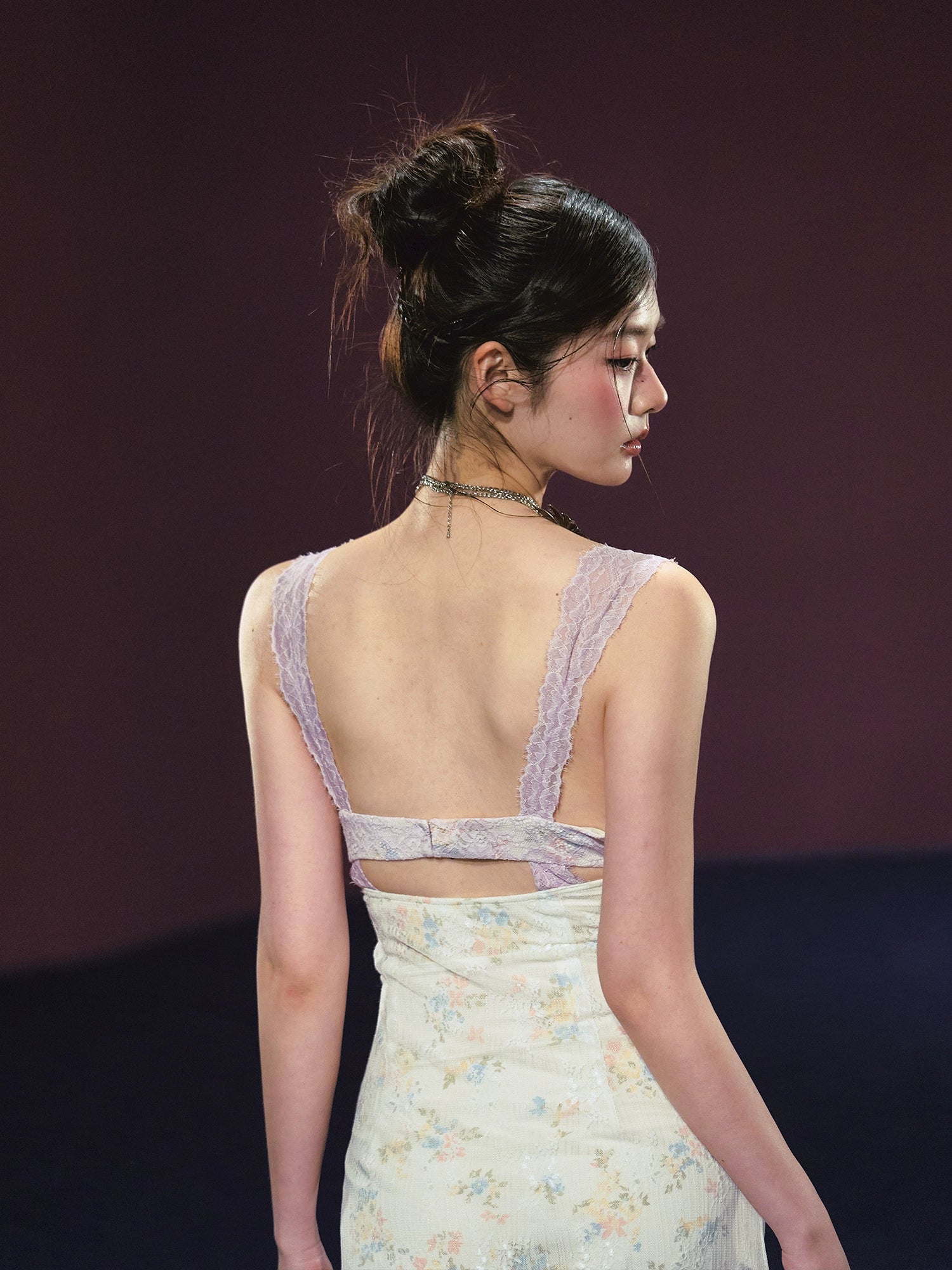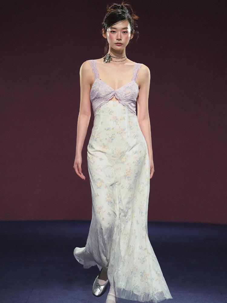 This dress features lace, floral patterns, a V-neck, patchwork design and hollow details.