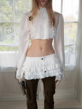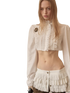 This ultra-cropped blouse features a romantic vintage-inspired design with delicate lace trimming and soft puff sleeves. The structured mini stand collar enhances the elegant silhouette, adding a refined court-style touch.