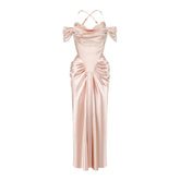 This dress is inspired by Baroque-era romance and refined French heiress aesthetics, crafted with a luxurious satin finish and sculptural tailoring. The corset-style bodice features structured fishbone construction that enhances the waist and contours the figure with elegance and support. Delicate shoulder straps balance the structured silhouette, while the smooth satin texture adds a rich, polished sheen. Designed with heavy craftsmanship and a high-end sensibility, this piece is ideal for formal occasions, evening events, or statement dressing where vintage opulence meets modern femininity.