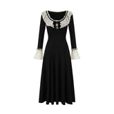 This elegant black knit dress draws inspiration from French pastoral romance with a refined, vintage undertone. Designed as a slim-fitting long-sleeve base dress, it subtly sculpts the figure while maintaining comfort for everyday wear. The clean neckline and softly flared hemline create a graceful silhouette, making it suitable for both workwear and casual outings. Crafted for autumn styling, this versatile piece balances femininity and practicality, delivering a polished yet understated aesthetic ideal for commuting or refined daily looks.