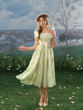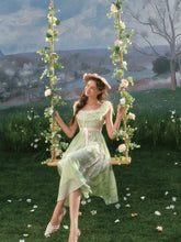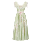 This French pastoral–inspired statement dress features a romantic off-shoulder neckline and intricate lace detailing, creating an ethereal fairy-like silhouette. Designed with couture-level craftsmanship, the softly structured bodice highlights the waist while the flowing skirt enhances movement and elegance. The fresh green tone evokes a natural, garden-inspired mood, making it ideal for vacations, garden parties, photoshoots, and special occasions. A refined yet dreamy piece that blends classic French charm with delicate femininity.