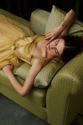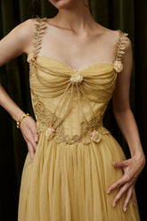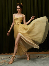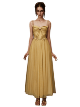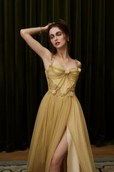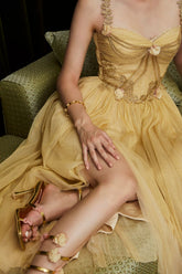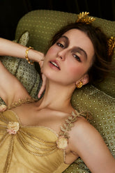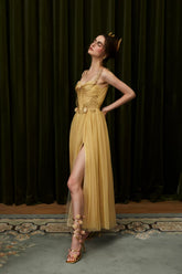 This luxurious statement gown draws inspiration from ancient Egyptian elegance, blending exotic goddess aesthetics with refined French couture craftsmanship. Designed with a sculpted golden corset structure, the dress defines the waist and enhances feminine curves, while the flowing mesh layers create a dramatic, ethereal silhouette. The long-length cut delivers regal presence, making it ideal for formal banquets, red carpet moments, ceremonial occasions, and high-fashion editorial styling. Rich in detail and visual impact, this piece embodies opulence, strength, and timeless allure.