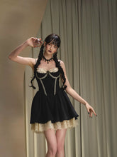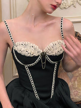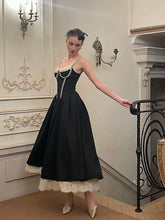 This statement little black dress is designed with a bold French aesthetic that blends vintage elegance and playful drama. Featuring a structured corset bodice with classic fishbone construction, the dress defines the waist and enhances the silhouette with refined shaping. The delicate spaghetti straps add lightness to the look, while the softly puffed skirt creates volume and movement, giving it a charming yet edgy presence. Available in both short and long lengths, this dress is ideal for birthdays, parties, or light formal occasions, offering a versatile balance between sophistication and youthful allure.