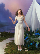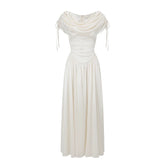 This elegant white dress is designed with a refined French court-inspired aesthetic, delivering a sophisticated yet romantic presence. Featuring a graceful draped neckline, the design creates soft movement across the bodice, enhancing the neckline and shoulders with effortless elegance. The streamlined silhouette gently defines the waist while maintaining a fluid, elongated line, making it both flattering and timeless. With its clean structure and elevated design sensibility, this dress is ideal for summer occasions, formal gatherings, or refined daytime events, offering a high-end minimalist charm with a classic French touch.