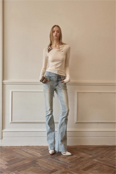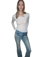 This fitted long-sleeve top features an asymmetric Henley neckline that creates a distinctive and modern silhouette. The tailored cut follows the natural body lines, enhancing shape while maintaining a clean and minimal appearance.